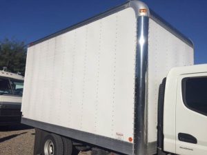 CANTER DRY VAN TRUCK, AUTOMATIC, TRANSMISSION, 62,989 MILES, 133″, WHEELBASE, 215/75R17.5 ALUMINUM, WHEELS, 70% TREAD ON TIRES,, GENERAL 14′ ALUMINUM BODY W/ROLL, UP DOOR.